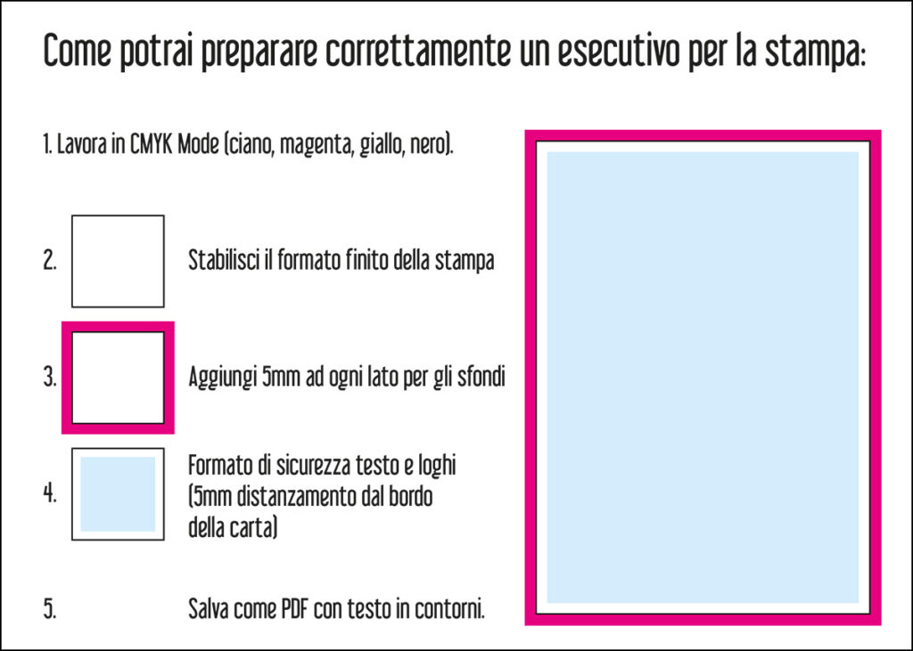 Con queste indicazioni potrai preparare correttamente un esecutivo per la stampa. Usa la check list per controllare in velocità, se hai qualche dubbio guarda gli approfondimenti.